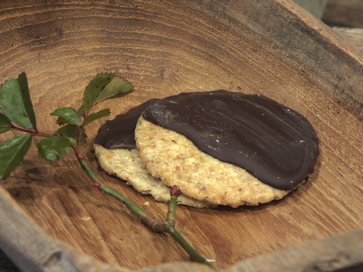 『ブランクッキー』にクーベルチュールチョコレート(72%)をコーティングしました
